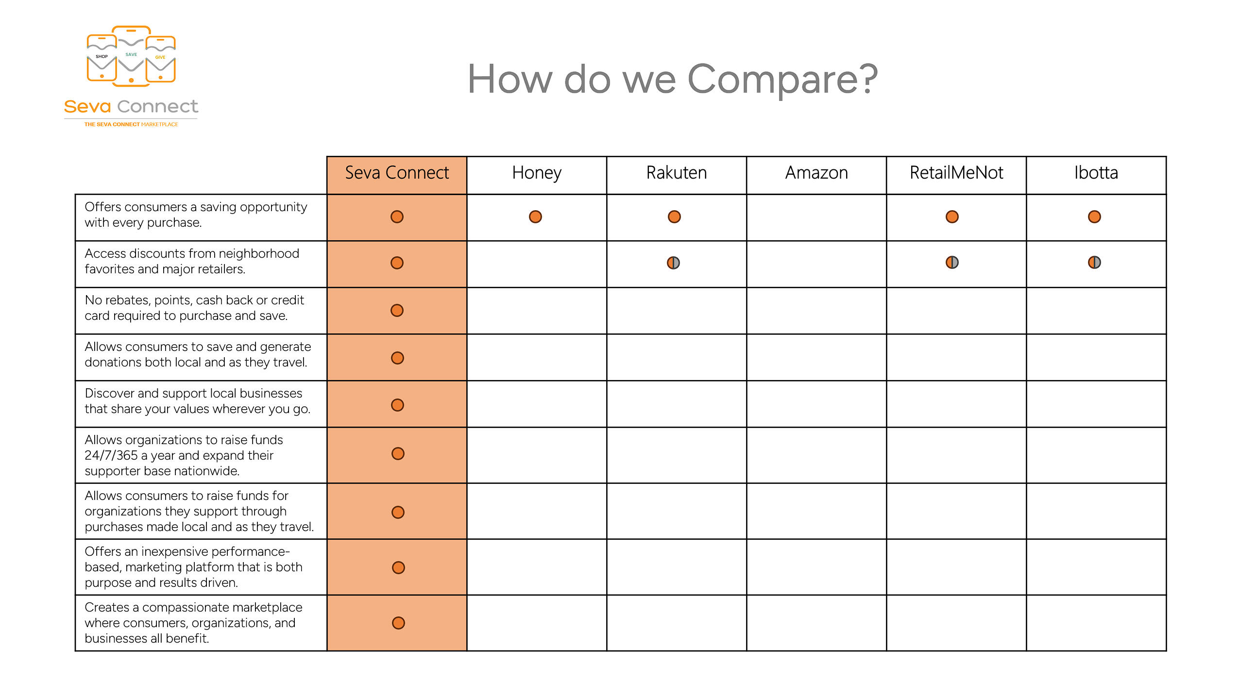 The Seva Connect Marketplace allows consumers to save and at the same time raise funds for organizations they support through their daily purchases made in their local community or as they travel throughout the nation.